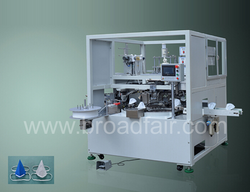 立體口罩頭掛熔接機(jī)為繼立體口罩本體后,采用超聲波焊接的方式將松緊帶按頭掛方式熔合于口罩兩側(cè),僅需一名操作員將口罩本體一個(gè)個(gè)置放于模具上,從塑料鼻線(xiàn)焊接到松緊帶焊接均由設(shè)備自動(dòng)完成。